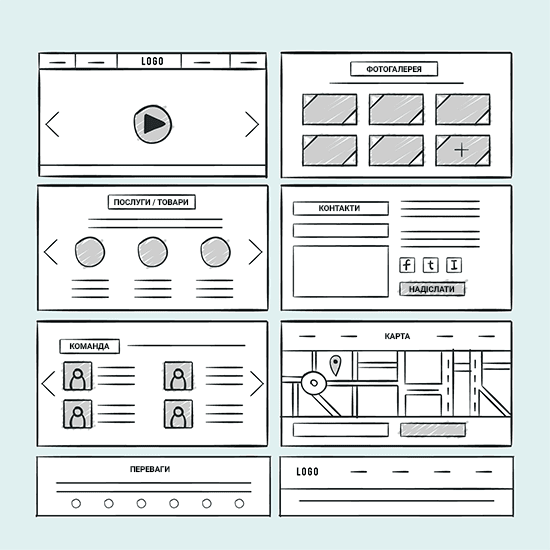 Блок сайту – це “прямокутник” з окремим контентом та дизайном (але в стилі сайту). Приклад блоків: “Про компанію”; “Переваги”; “Команда”; “Портфоліо”; “Контакти” тощо.